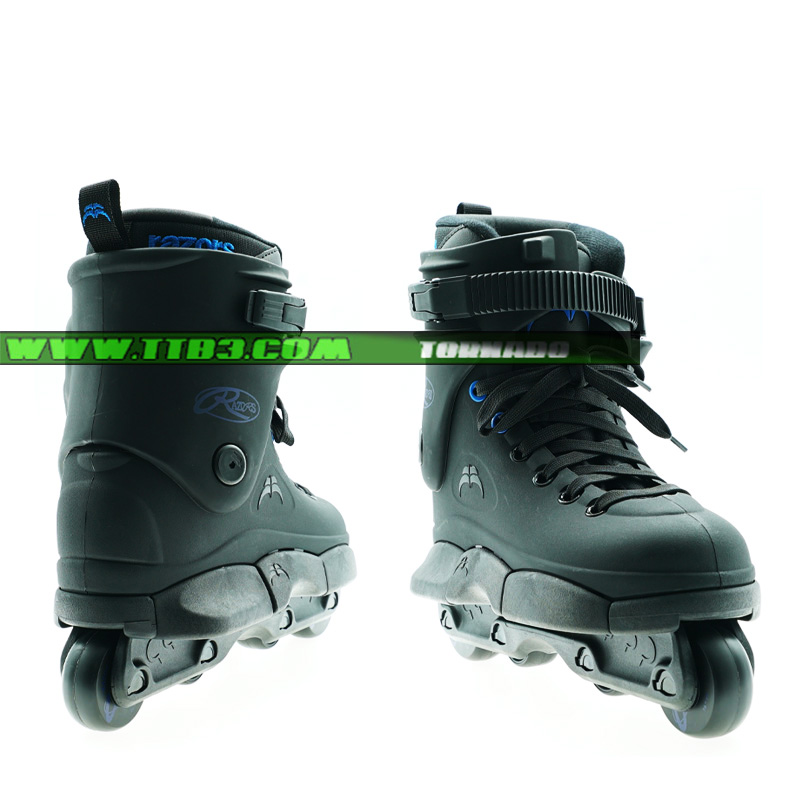 同样选用的是最熟玩家喜爱的FLT3刀架,金属扣心,使得轴承与刀架之间达到更贴合的状态,适中的卡位顺畅耐用,内靴有防滑鞋底以及一个新的尼龙搭扣,RAZORS 黑色 56mm/90a低重心极限轮,铬钢精密轴承和GC42mm小轮,全黑配色,专业极限轮滑鞋性能之选